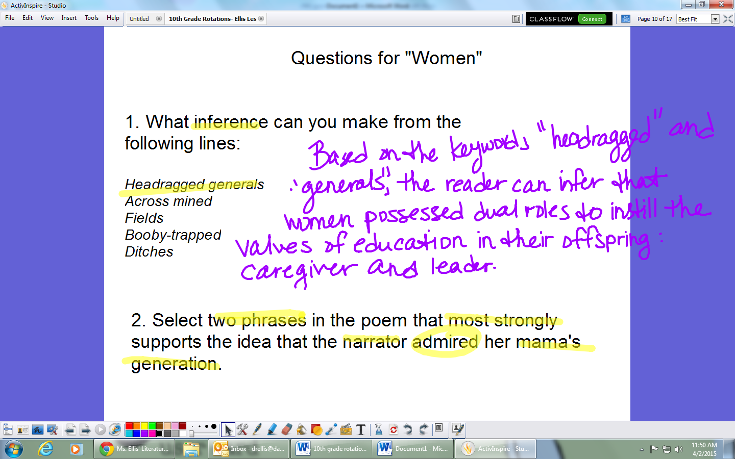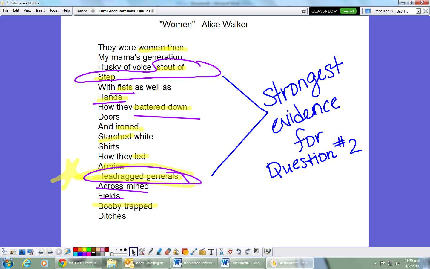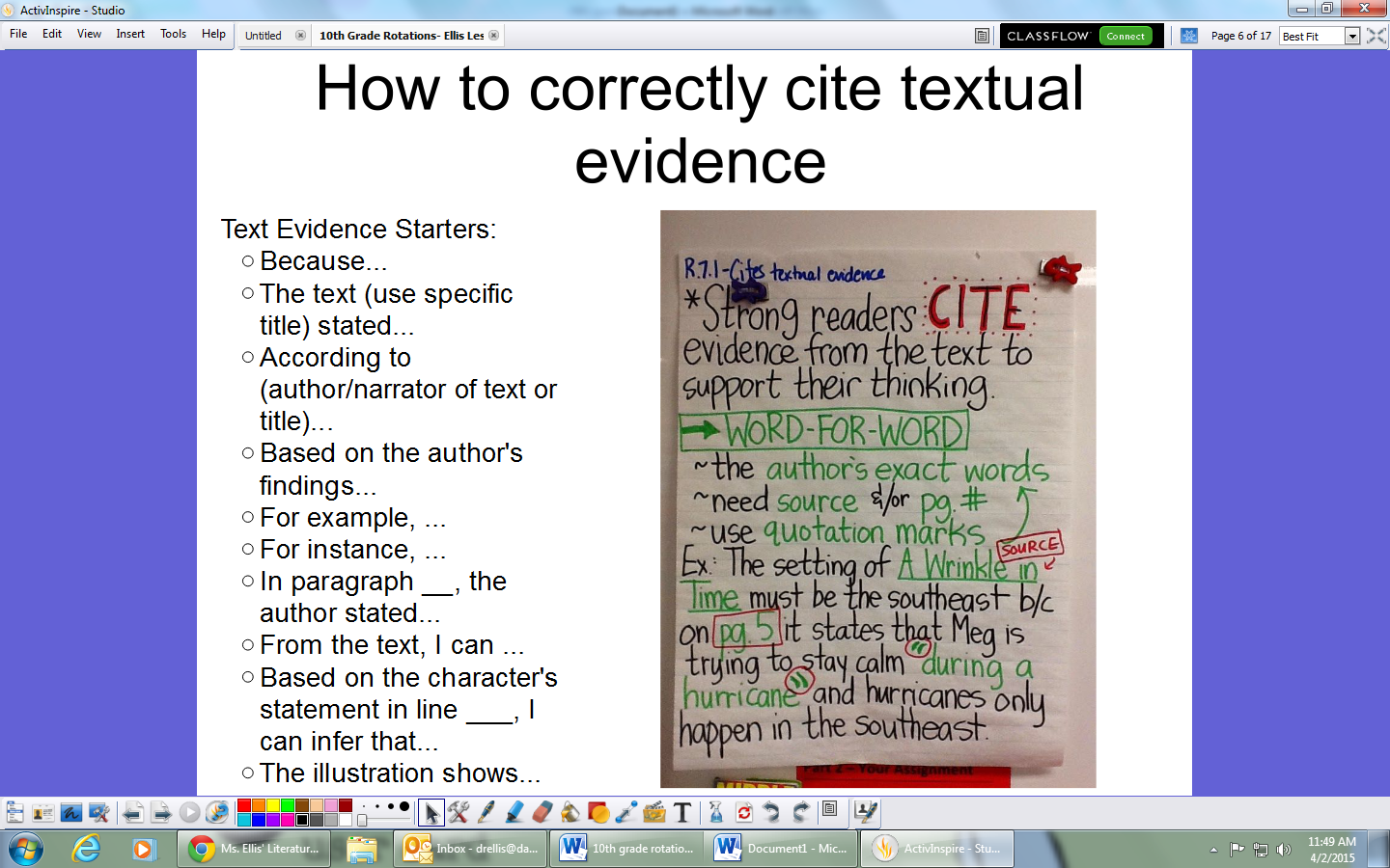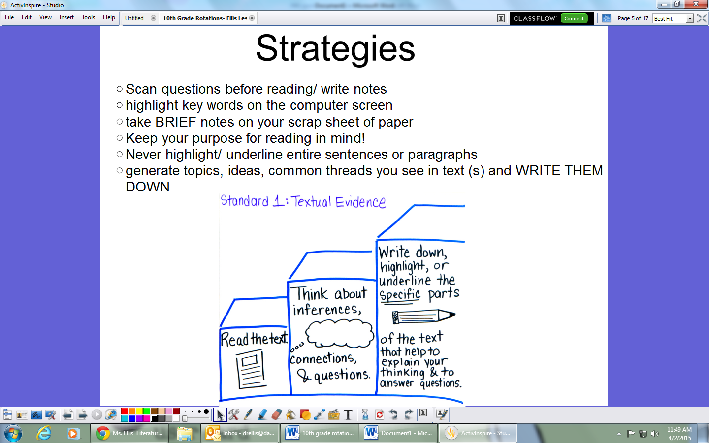 During our 10th Grade Rotations at Robert Morgan Educational Center, each teacher selected a standard in need of review. I retaught how to find and utilize the strongest evidence possible. In the screen shots below, you will see some brief notes from my lecture. The notes I modeled on our dry erase board were not saved as images.